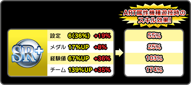 属性統一した機種以外を遊技した場合は、+の値は加算されません。上記例の場合、「設定6:36%/メダル:17%/経験値:67%/チーム:139%」のスキル効果となります。