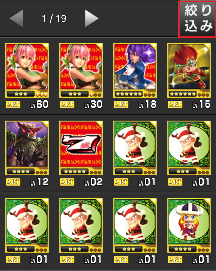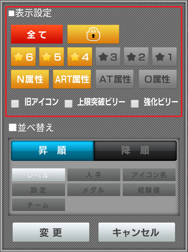 - ・「旧アイコン」「上限突破ビリー」「強化ビリー」の項目はチェックマークありの状態にすると、一覧に表示されます。