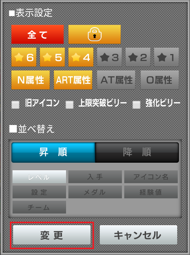 ※「降順」&「左上の項目(レベル/合成効果/レアリティ)」の設定がオススメです。