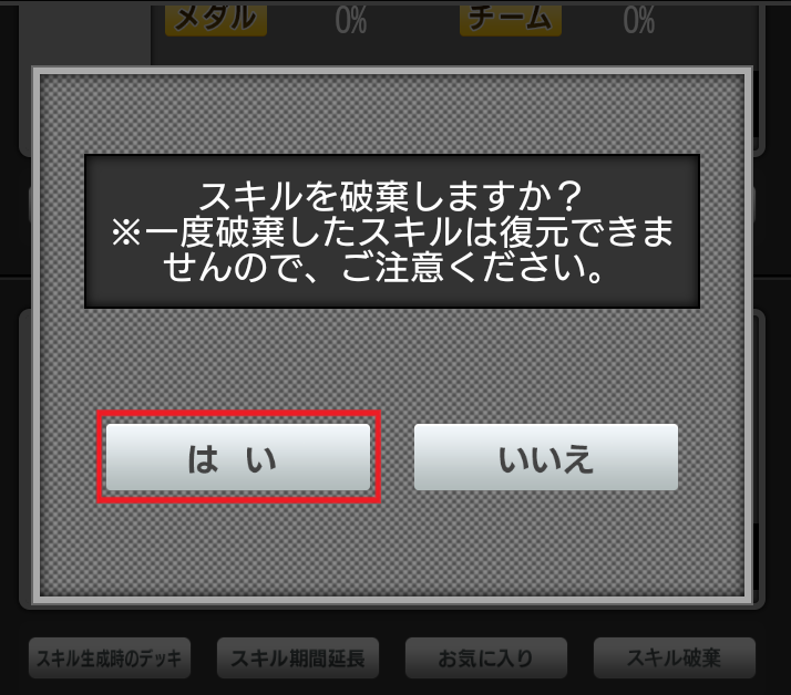 ②確認画面で「はい」をタップするとスキルが破棄されます。