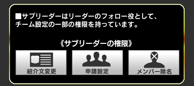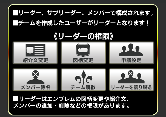 - ■ リーダーは、他にレベル10以上のチームメンバーがいる場合に限り「リーダーを譲り脱退」を行うことができます。(「リーダーを譲り脱退」を行ったリーダーは、1週間はチームへの加入申請を行うことができません。)