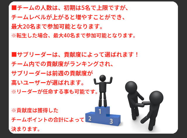 - ■ 「チーム解散」を行ったリーダーは、翌月まで新しいチームを作ることができなくなり、さらに1週間はチームへの加入申請を行うことができません。